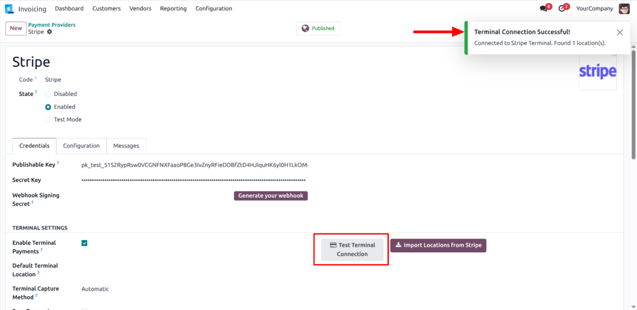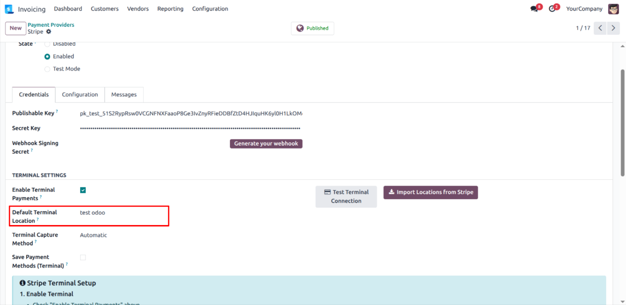 - Now also you may select a default terminal location on the stripe provider configuration page.