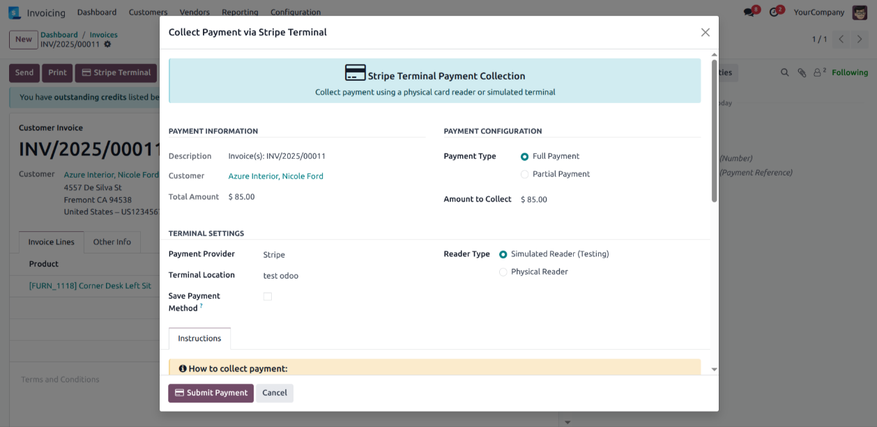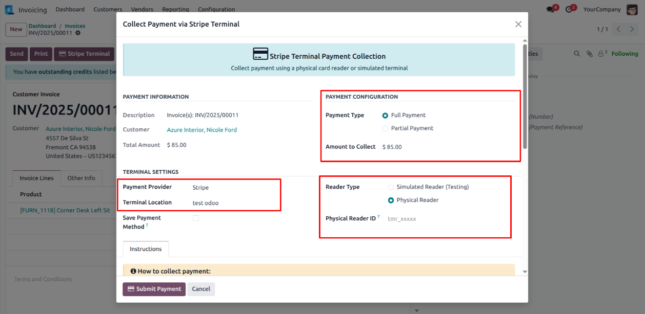 - The payment wizard appears, allowing you to select the amount and terminal reader. Submitting the payment creates a payment transaction in Odoo and sends a payment request to the selected physical terminal.